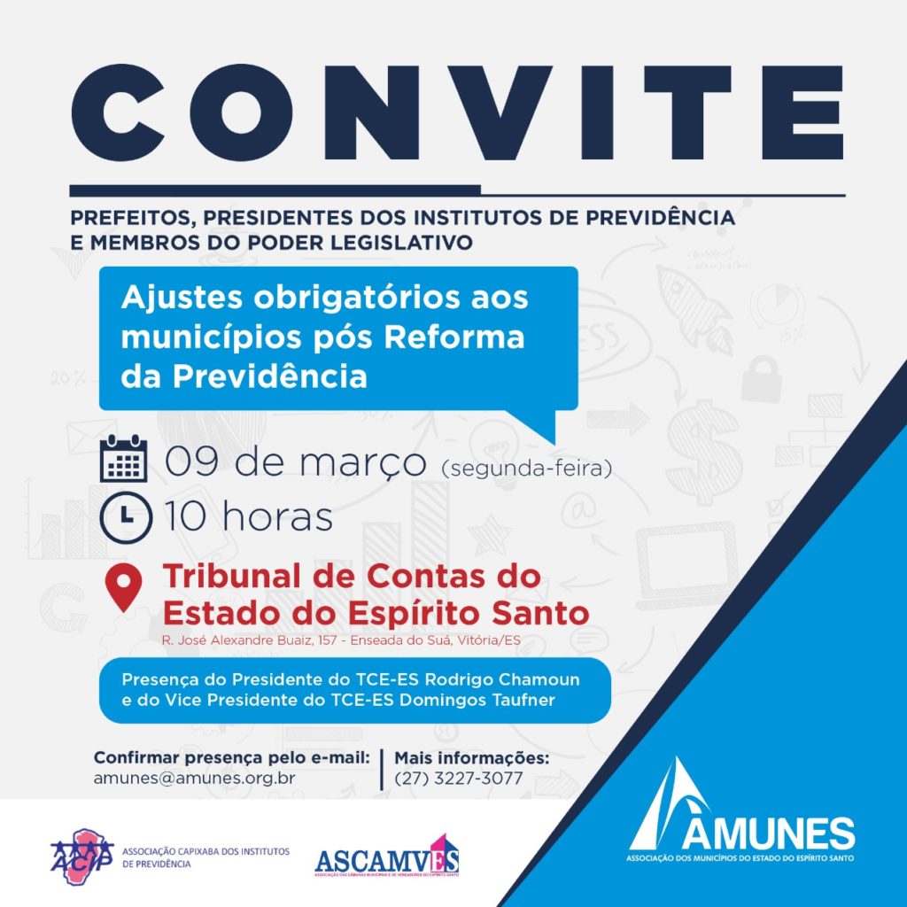 A apresentação do vice-presidente do Tribunal de Contas/ES, conselheiro Domingos Taufner, sobre o tema “Ajustes obrigatórios aos municípios pós Reforma da Previdência” acontecerá na próxima segunda-feira (09). ✅Por isso, faça a sua inscrição e não perca essa oportunidade de aprendizado.