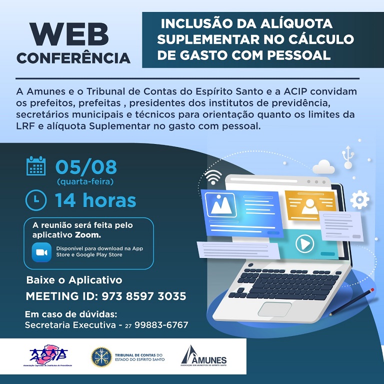 Amanhã, dia 5 de agosto, às 14h, vocês não podem perder a web conferência referente à inclusão da alíquota suplementar no cálculo de gasto com pessoal. A reunião acontecerá de forma virtual por meio do aplicativo Zoom, e conta com a parceria da Associação Capixaba dos Institutos de Previdência (ACIP) e da Associação do Municípios do ES (Amunes) com o Tribunal de Contas (TCE-ES).
